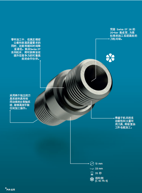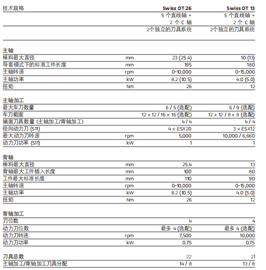 Swiss DT 系列瑞士型車床專業(yè)設計滿足典型長 短車削工件的各種要求。該系列機床簡單易 用,加工直徑達 13 和 25.4 mm,可顯著提高生 產效率。Swiss DT 系列采用先進的技術和高效的五軸運動結構,是所有車削和銑削加工的理想之選。